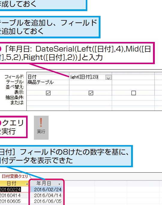 2. 日付の抽出: 年、月、日を個別に抽出するには、Year()、Month()、Day()関数を使用します。例: Year([日付フィールド])。