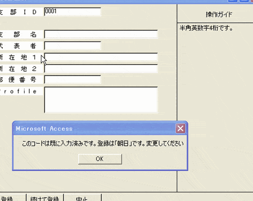 - 一致するレコードが見つかった場合、ユーザーに警告メッセージを表示し、データの入力をキャンセルします。