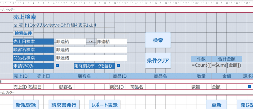- 最後に、子フォームを作成します。子フォームには、子テーブルのフィールドを配置し、親フォームにサブフォームとして連結します。