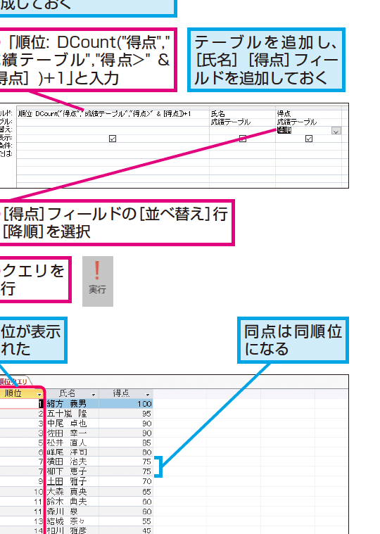 - AccessのDCount関数 は、指定された条件を満たすレコード数を数えるため、より柔軟な順位付けが可能です。例えば、重複した数値 に対して異なる順位を割り当てることもできます。