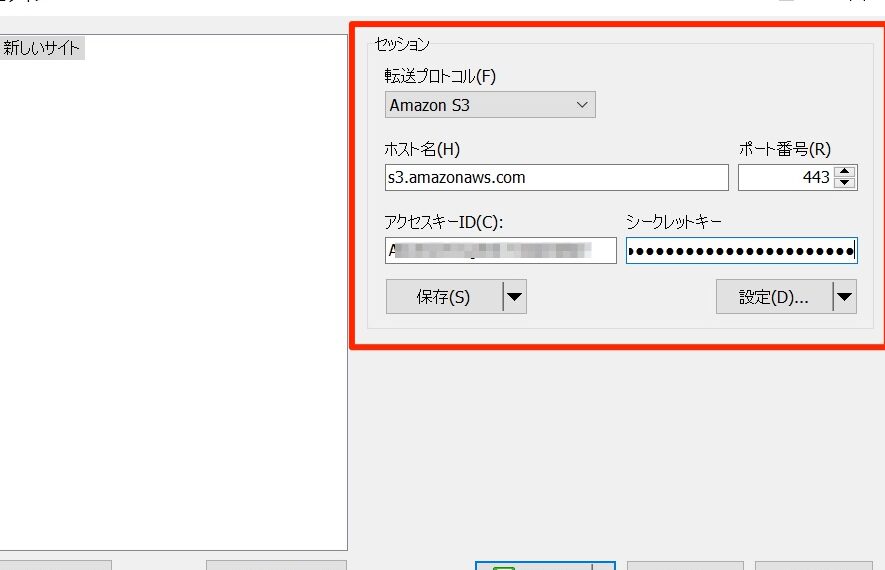 - FTPクライアントでS3バケットのアクセスキーIDとシークレットアクセスキーを入力します。