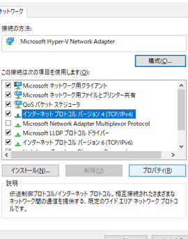 - 現在接続中のネットワークのプロパティを開き、IPv4の設定を有効にします。